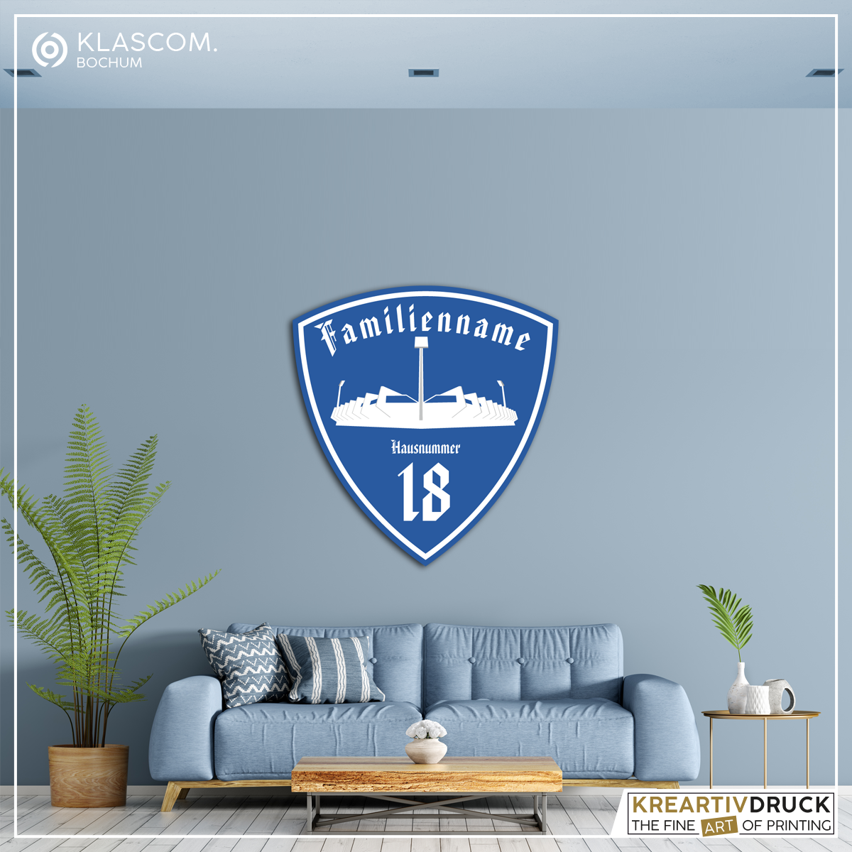 Die Form der konturgeschnittenen Aluminium-Verbundplatte [Alu-Dibond® oder vergleichbar] ist dem Emblem von einem bekannten Fussball-Verein von Bochum nachempfunden und wird einseitig mit UV-Lack in den Farbtönen "Blau-Weiß" matt oder glänzend bedruckt und veredelt. Auf Wunsch bedrucken wir das Board mit einer anderen Hintergrundfarbe aus dem CMYK Farbraum.
