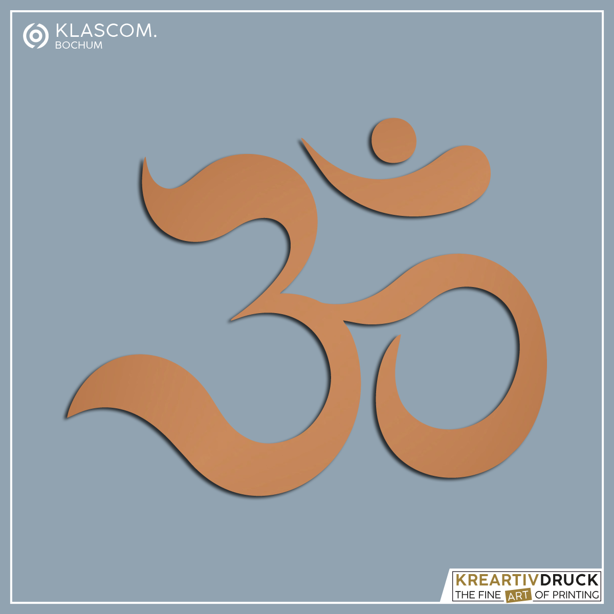 Freistehendes Symbol / Zeichen "Om" (Aum) konturgeschnitten aus 3 mm starken Aluminium-Verbundplatten (Alu-Dibond® oder vergleichbar) mit einer gebürsteten, metallischen Oberflächenstruktur (Butlerfinish) in Silber-Optik (Aluminium blank), Gold, Bronze, Kupfer, Rosé mit UV-Schutzlack für In- und Outdoor Montagen.