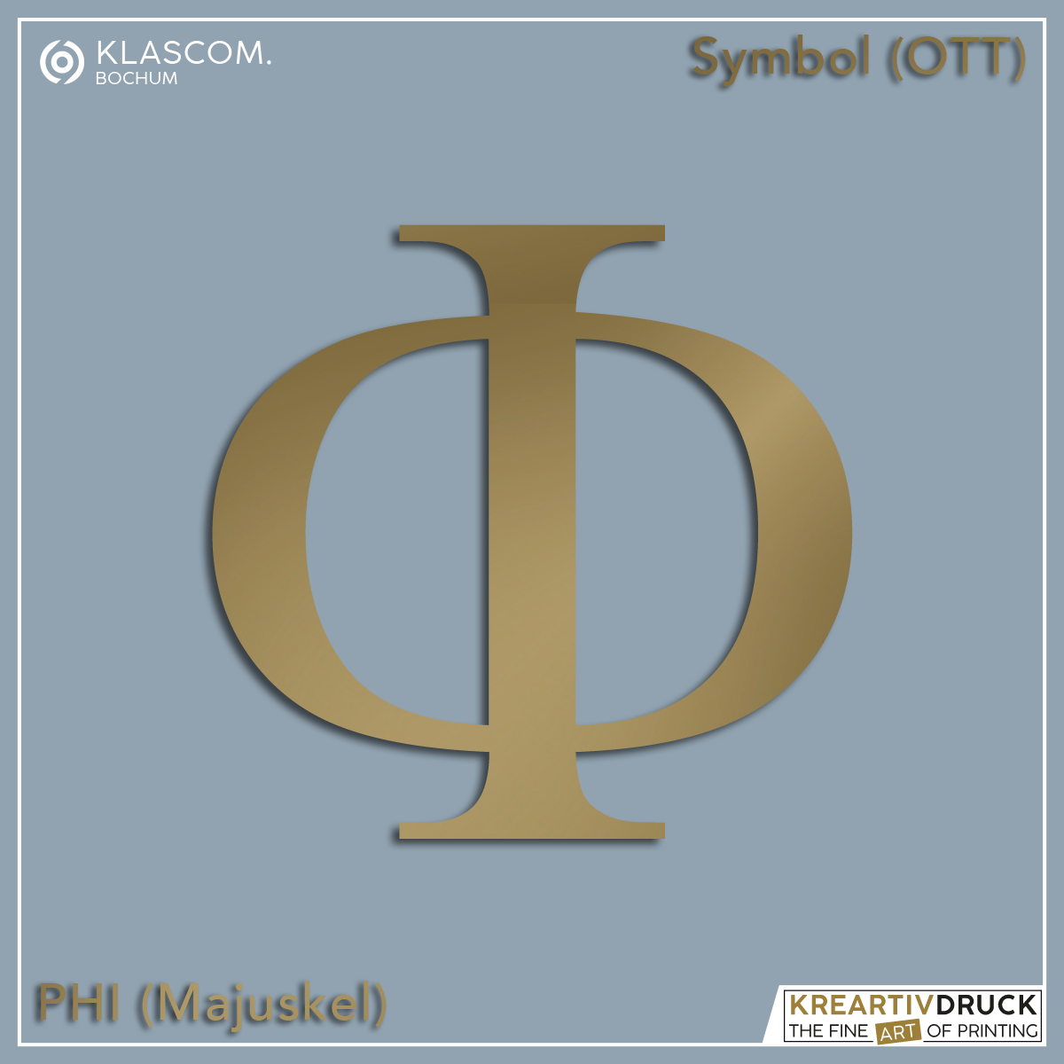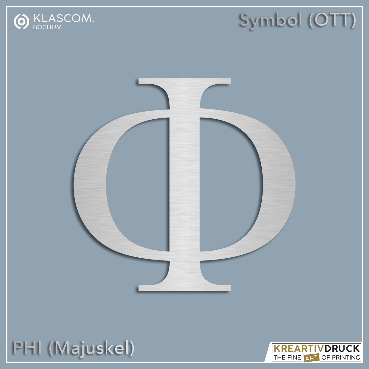 Freistehendes Zeichen / Symbol (griechischer Buchstabe) "Phi" konturgeschnitten aus 3 mm starken Aluminium-Verbundplatten (Alu-Dibond® oder vergleichbar) mit einer gebürsteten, metallischen Oberflächenstruktur (Butlerfinish) in Silber-Optik (Aluminium blank), Gold, Bronze, Kupfer, Rosé mit UV-Schutzlack für In- und Outdoor Montagen.