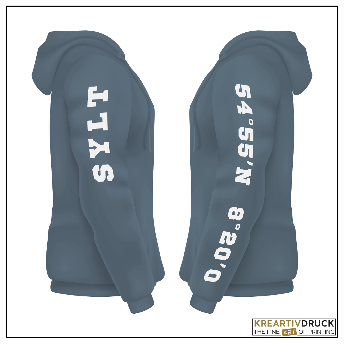KREARTIVDRUCK veredelt diesen bequemen Hoodie in der Standard-Version auf dem Rücken (Text, Kompassrose und Koordinaten) und der linken Brust (Text und Koordinaten). Auf Wunsch bedrucken wir jeden Hoodie zusätzlich nach Deinen eigenen individuellen Vorgaben. Für weitere Motive, wie z.B. Logos, Namen oder Club-Embleme stehen Dir verschiedene "individuelle Druckpositionen" zur Auswahl.